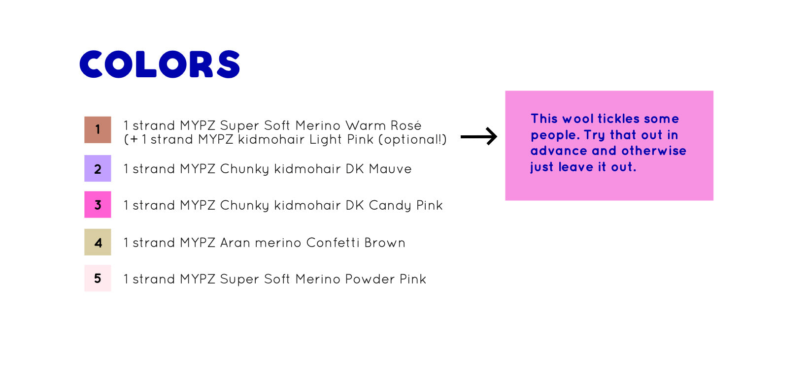 COLOR 3: ±82 meter MYPZ Chunky kidmohair DK (78% Mohair, 13% Wool, 9% Nylon | 50g - 100m) 3 or any other hairy DK - weight yarn (+15m S/M) (+30m M/L) (+50m L/XL) (+90m XL/XXL) (+130m 3XL)